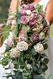 Their overall theme complimented perfectly by her bouquet of soft purples, pale pinks, and vivid whites even as the reclaimed wood of the reception tables seemed to make the subtle pops of color all the more dramatic.